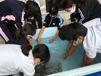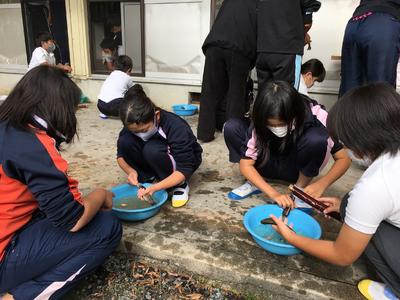 午前の活動は、ニジマスつかみです。生きている魚をつかむのは、なかなか難しかったようです。捕まえた魚は、調理をしていただくことにしています。大切な命をいただきます。