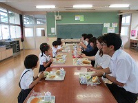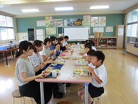 7月5日に、1年生と保護者の方によります給食試食会が行われました。家庭科室でおうちの方と向かい合って給食をいただきました。おうちの方とおしゃべりをしながら、楽しく給食をいただきました。試食会の後は、国語で学習した「おむすびころりん」の劇を披露し、おうちの方全員から感想をいただき、とても喜んでいました。その後の授業参観、水難救助講習会、学級懇談会も大変お世話になり、ありがとうございました。