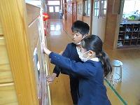 2年生の算数の授業で、1mものさしを使って、いろいろなものの長さを調べました。はじめに自分で長さを予想してから、実際に1mものさしで調べていきました。くつ箱や理科室の棚の長さなど、子どもたちはいろいろなものを意欲的に調べていました。中には、予想とピッタリ当たった人もいたようです。