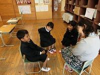 写真は4人でクイズ大会をしている様子です。「ぼくが大きくなったらなんの車を買うでしょう。」「わたしの好きな食べ物は何でしょう。」「私の好きなフルーツは何でしょう。」など、それぞれクイズを考えてみんなで答えていきました。たくさん笑って楽しい時間となりました。その後の授業参観もとてもよく頑張りました。