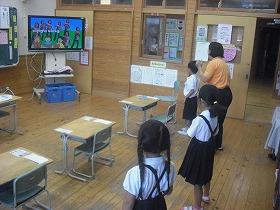 毎朝10分程度ではありますが、DVDを見ながら、英語を話したり体を動かしたりしています。1年生も、毎朝、楽しく体験しています。