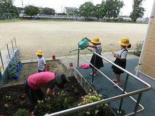 今日は、学級園にマリーゴールドとまつばぼたんを植えました。みんなが種から育てた苗もあります。3人で力を合わせて一生懸命うえました。最後に水もたっぷりかけて花の苗も喜んでいるようにみえました。これから、お世話もしっかり頑張っていきます。