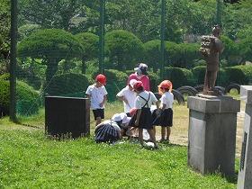 水の生き物以外にも、ちょうやバッタなどをつかまえている子どもたちもいました。かわいいアマガエルを見つけ、子どもたちは大喜びしていました。