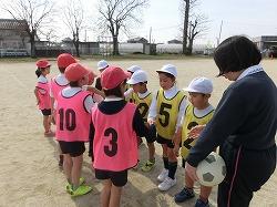 学習のめあては、「ボールと仲良くなろう。」です。はじめに、一人ずつドリブルの練習をしたり、ボールを蹴る練習をしました。次に、赤白に分かれてシュート練習をしました。そして、最後にゲームをしました。