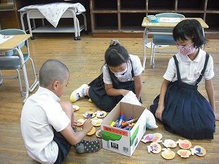 1年生15人が遊ぶおもちゃを作るのは大変ですが、2年生3人で協力して楽しく頑張っています。今日は、貝殻を使ってメダルを作りました。