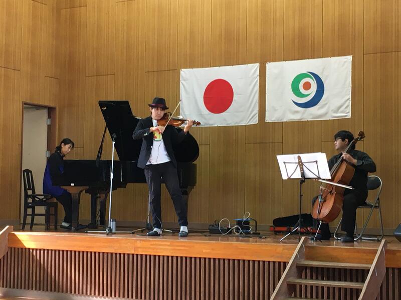 音楽の素晴らしさを身近に体験できる「玉名市アウトリーチ音楽会」が今年も11月11日(木)に、豊水小体育館にて実施されました。今年のゲストは「0RANGE」(オレンジ)さんで、バイオリンとピアノに加えて、特別参加のチェロも合わせた演奏でした。生の演奏が聴けて子どもたちもとても感動し、楽しいひと時を過ごすことができました。