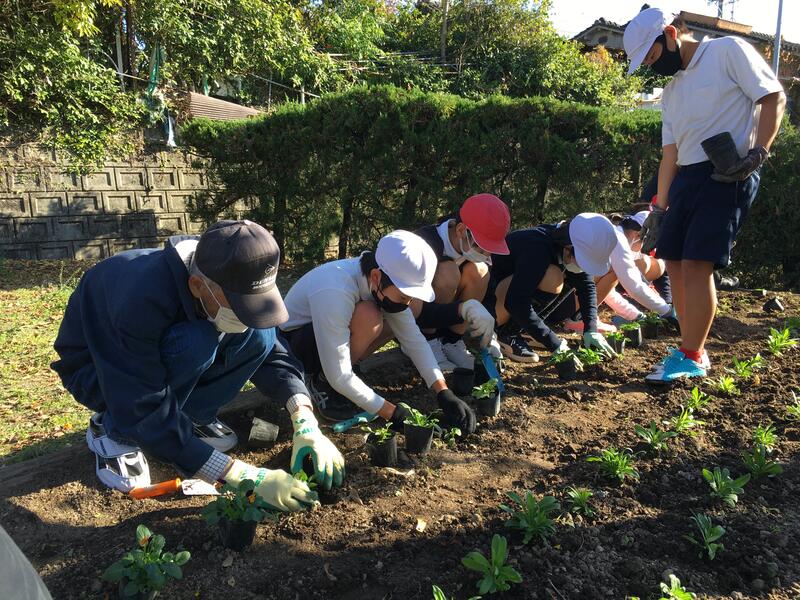 暖かい日差しの中、11月29日(月)の5校時に、「秋花の合同花苗植え」が行われました。5年生の種から育てたビオラは、小さなかわいい苗に成長しました。小野尻地区の豊寿会の方々と一緒に6年生が南門の花壇に、5年生が北門の花壇にノースポール・なでしこ・ビオラ・アリッサム・ストックの6種類の花苗を植えました。春に美しい花が咲くように、これからも花の世話をがんばります。