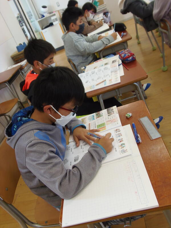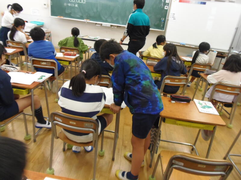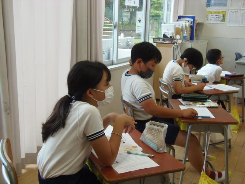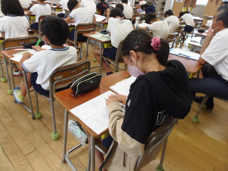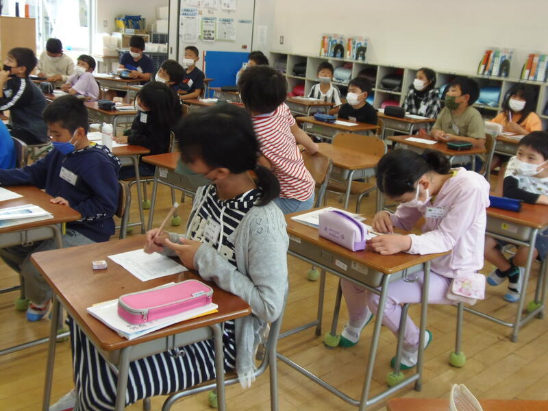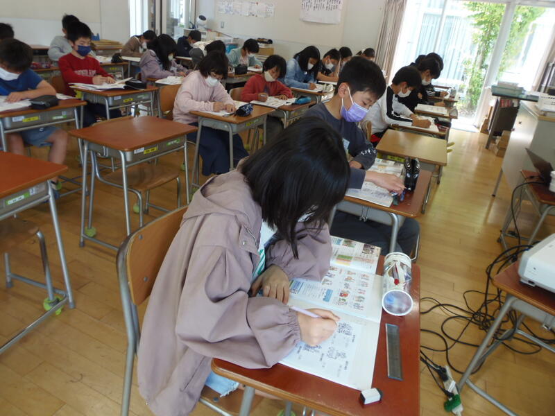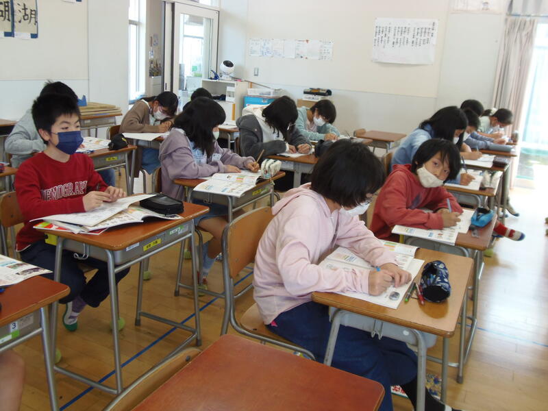4年生は、算数の問題を解いていました。よほど難しいのか、みんな真剣に解いていました。