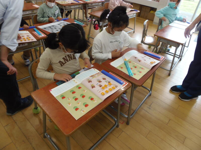 問題を解いて、その答え合わせをしていました。みんな結構、丸が多かったです。間違ったところもちゃんと見直しをしていました。