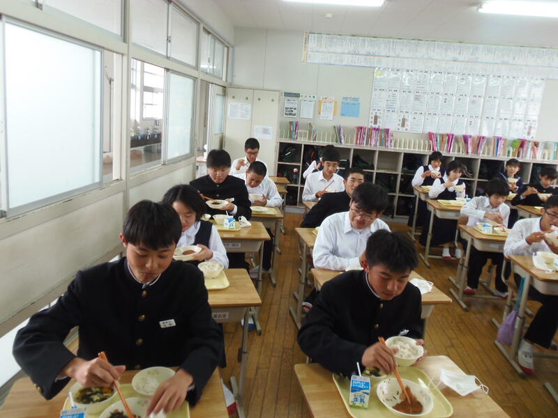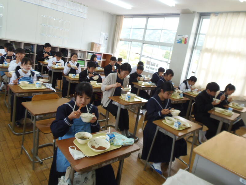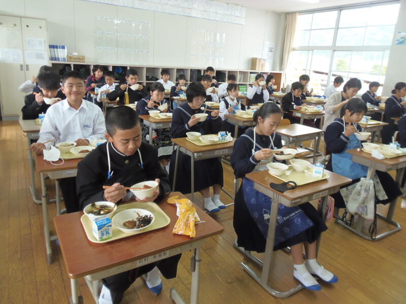 今週は、全国学校給食週間です。1日目の目乳は、明治22年の献立を再現し、セルフおにぎり、栄養みそ汁、塩サバ、たくあん、牛乳でした。