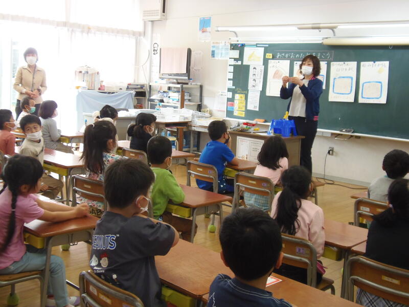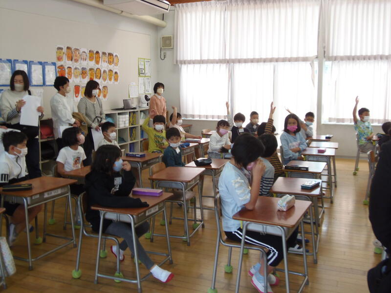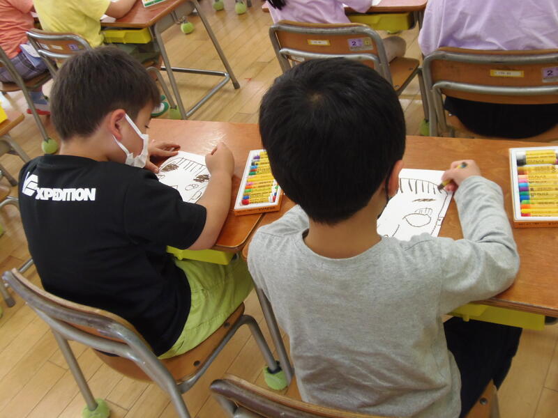 小2年生の授業の様子です。英語の授業で福笑いをしていました。顔の部位を英語でアップ、ダウンといいながら作成していました。できた福笑いの顔を見てみんな大笑いしていました。