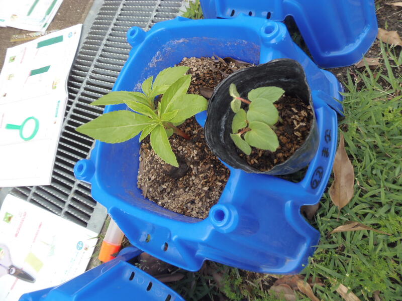 ホウセンカとオクラ、ヒマワリ、ピーマンを組み合わせて植えています。