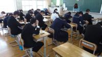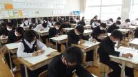 ↓ 中学2年生は、学力テストの英語のリスニングテストを受けています。