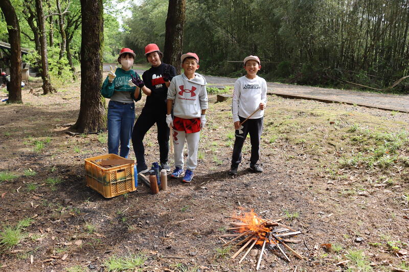 心地よく燃えるたき火の前で、みんないい笑顔でした!火おこし体験をもとに、明日の夕食は自分たちで作ります。楽しみです。