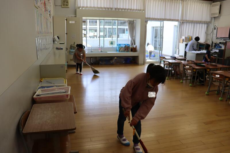 小学1年生は、今日から5時間授業です。掃除のしかたをしっかり覚えて、ほうきやぞうきんがけ、机やいすの移動をがんばりました!