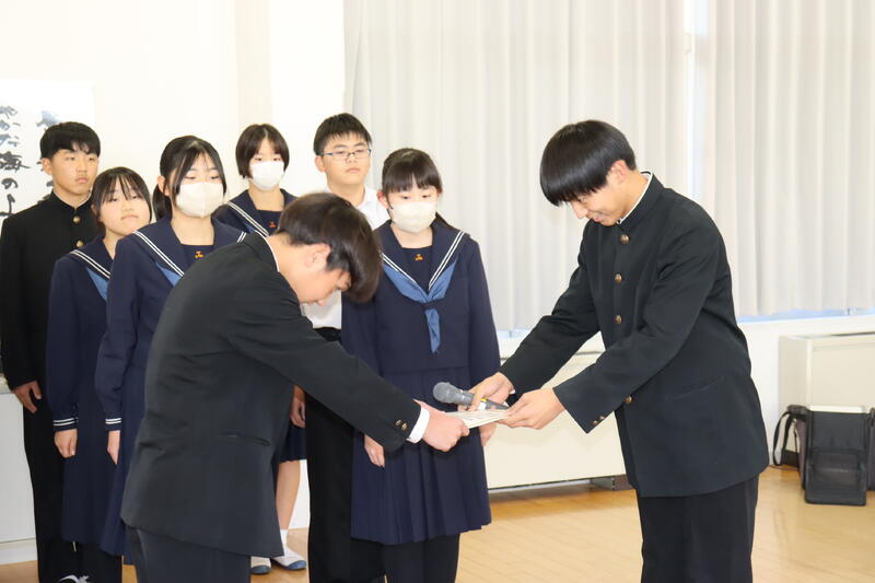 生徒会長から代表の委員長に任命状が渡され、決意を述べました。