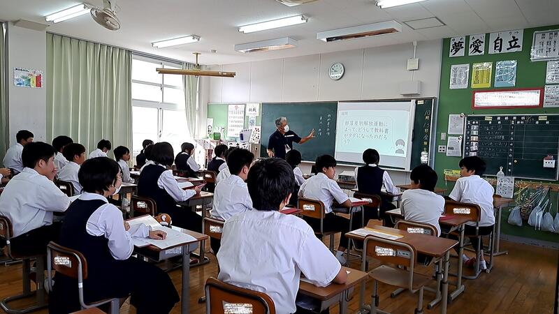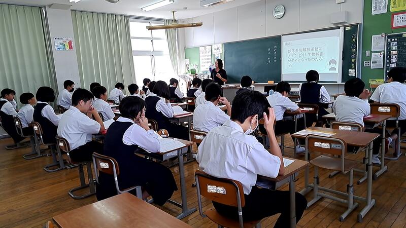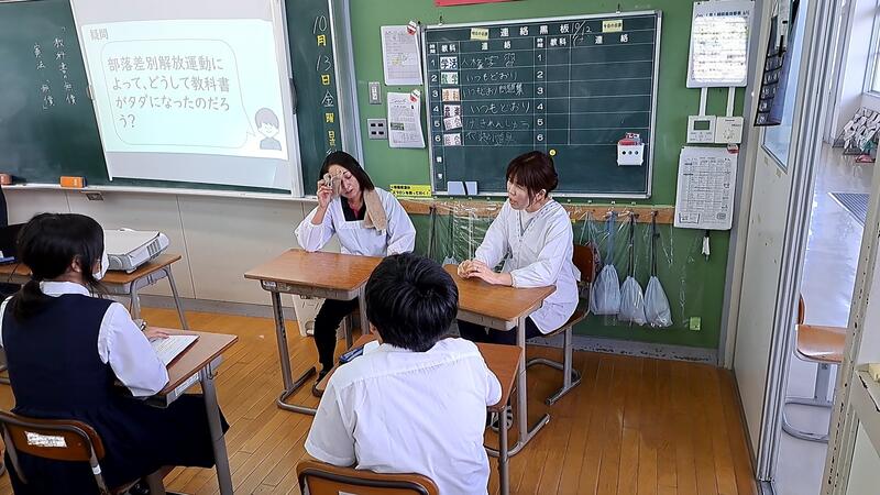 小学1年生から中学3年生まで、すべての学年において、後期の人権学習が始まりました。中学1年生の授業の様子です。「教科書無償の闘い」を題材に、学びを深めていきます。今日は、先生たちによる劇が披露されました。秋休みを使って練習されたとのこと、先生方の熱い思いが伝わりました。