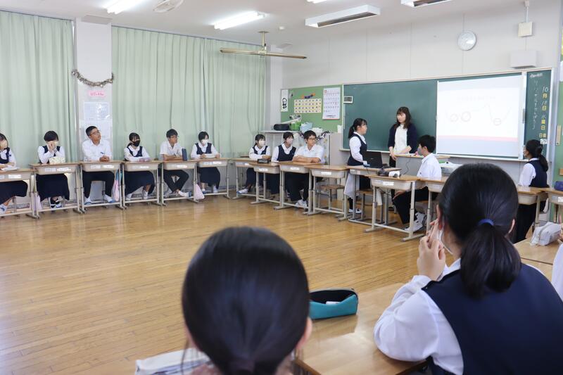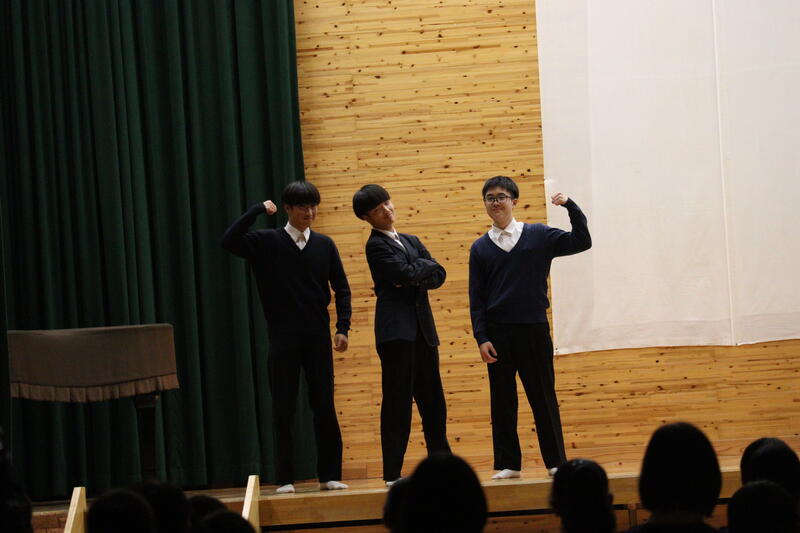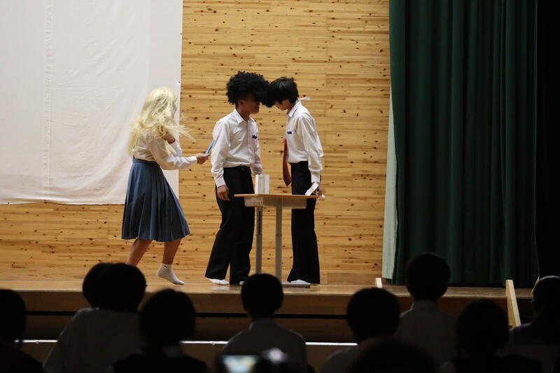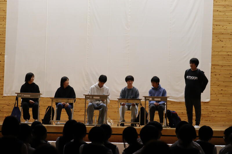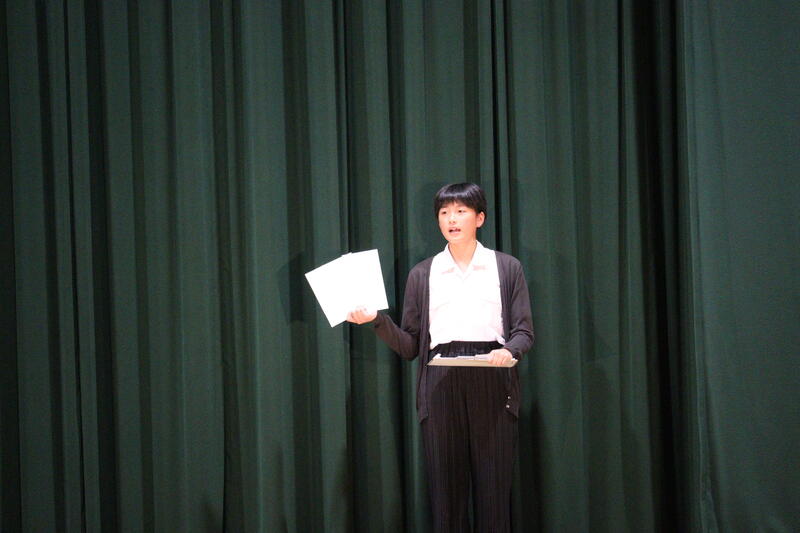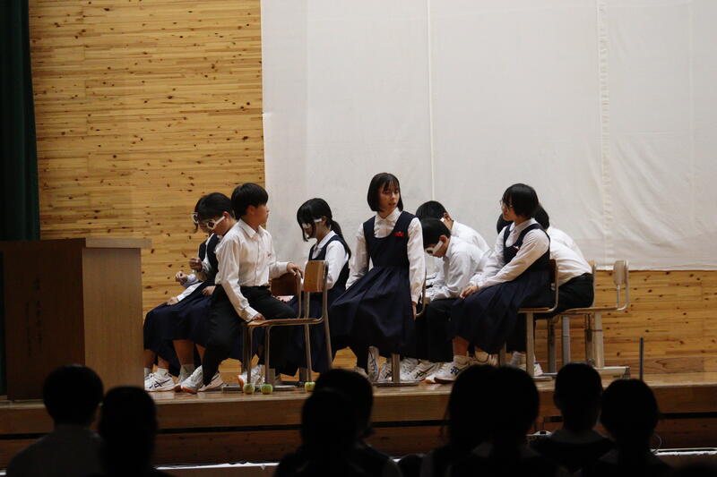 9月に行った職場体験をもとに、学んだこと、考えたことを、プレゼンテーションと寸劇で発表してくれました。役者ぞろいの2年生、ユーモアを交えながら、堂々と発表してくれました。「働くことは『誰かのために』」という言葉がとても心に残りました。