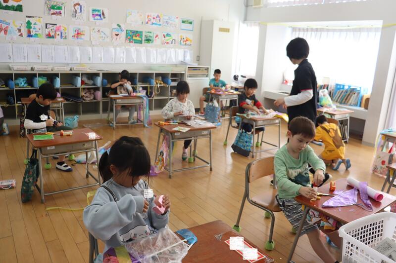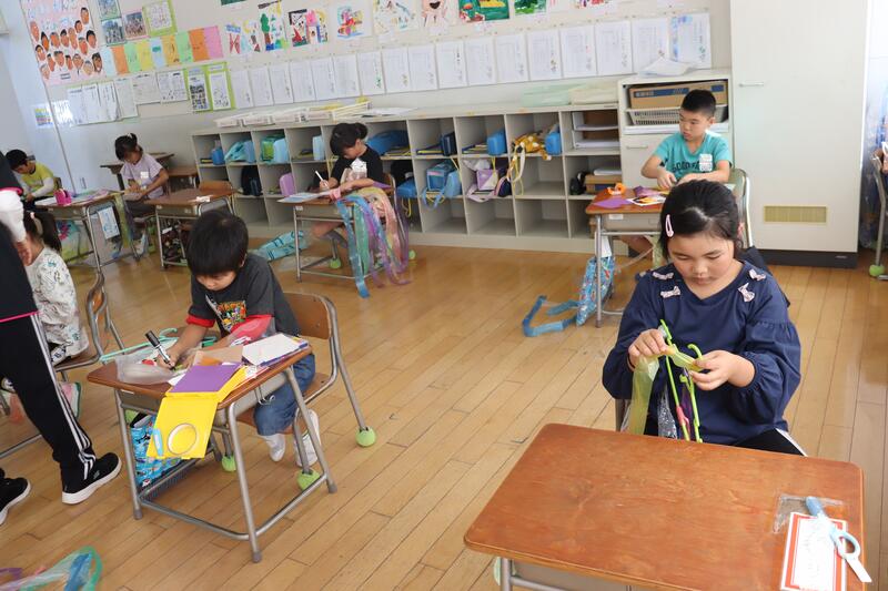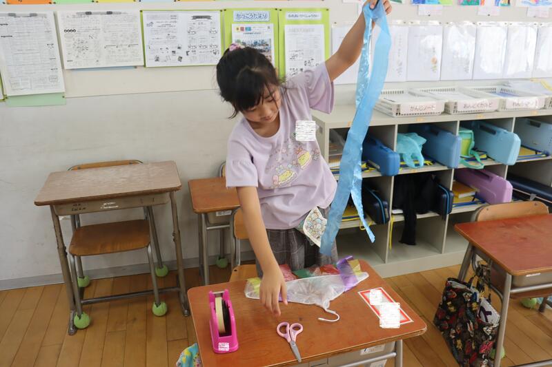 小学校1年生の図工の様子です。ハンガーにひらひらと吹き流しをつけて、そこに飾りをつけていきます。宇宙をイメージした作品、海をイメージした作品など、子どもたちの発想に驚かされます!