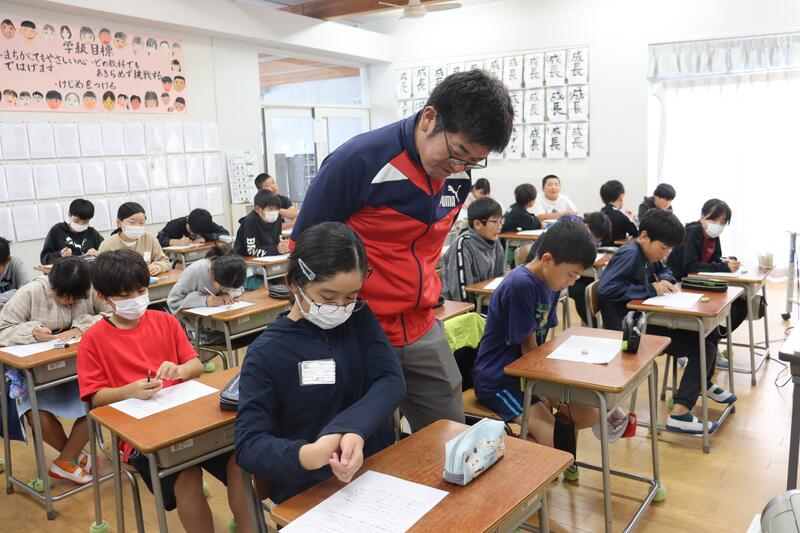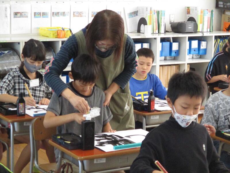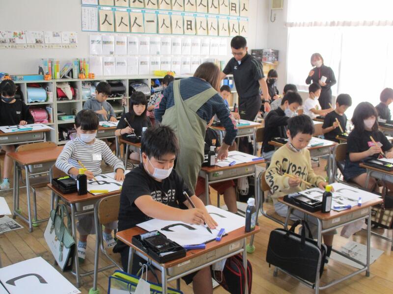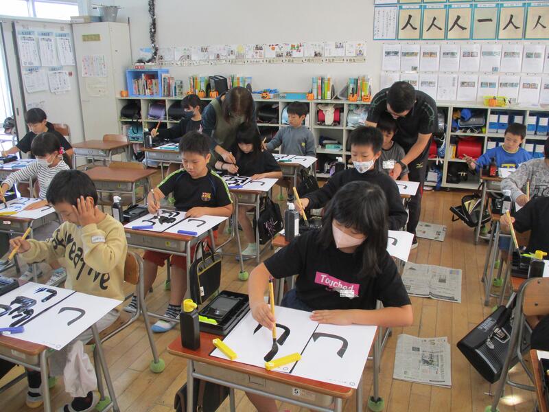 小学3年生は、書写の授業でした。毛筆で「曲がり」の練習をしています。地域の方がゲストティーチャーとして毎回来てくださっています。本当にありがたいです。おかげさまで、4月からみんなとても上手になりました!