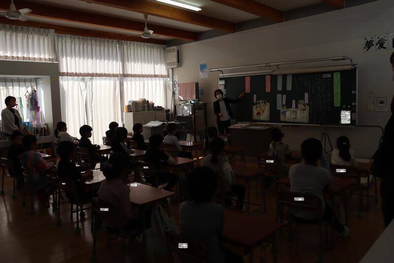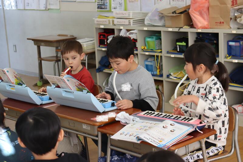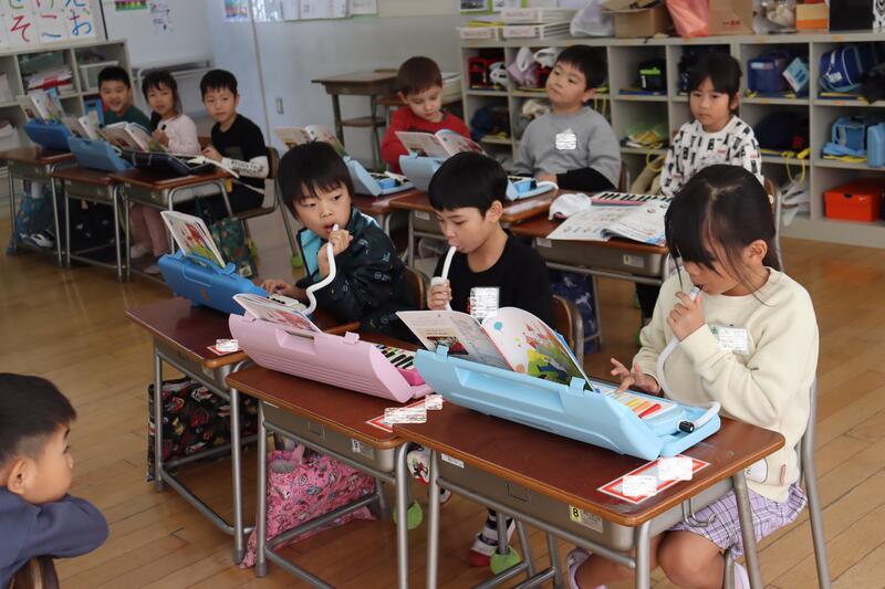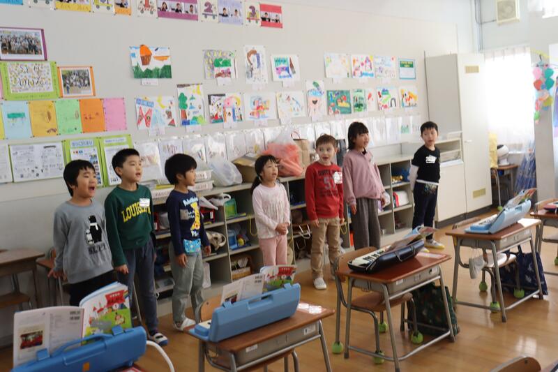 小学1年生は音楽で、「やまびこ」を歌っていました。2グループにわかれて、お互いに呼びかけ合っています。♪やまびこさーん
