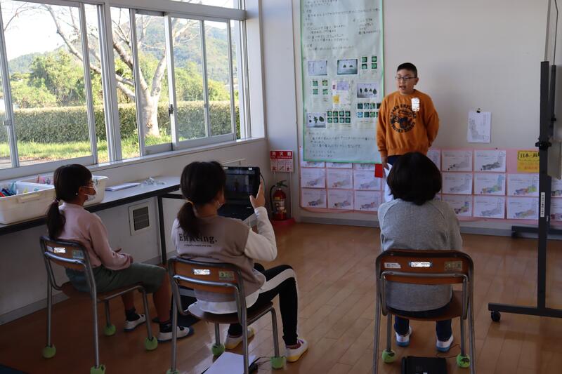 小学4年生は、スピーチの練習をしていました。グループで協力して、スピーチの様子をタブレットPCで撮影し、チェックしています。
