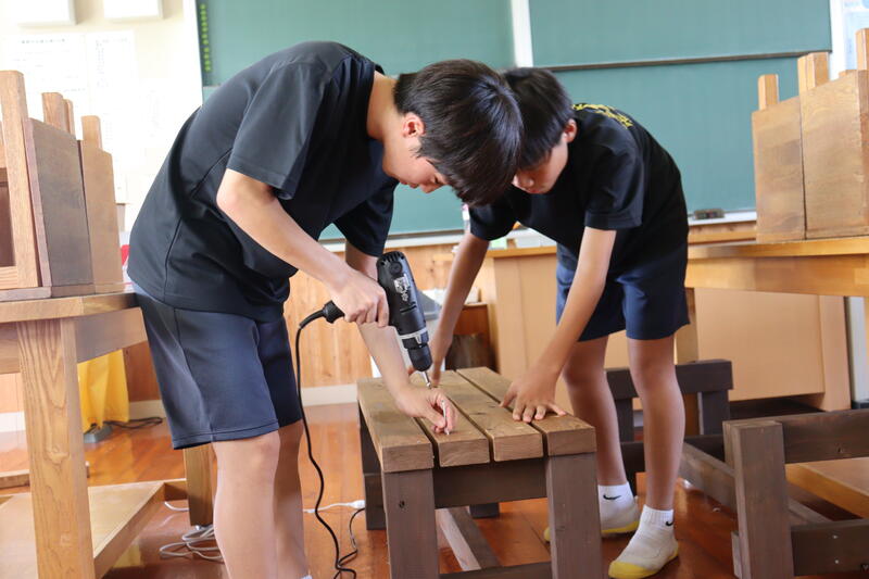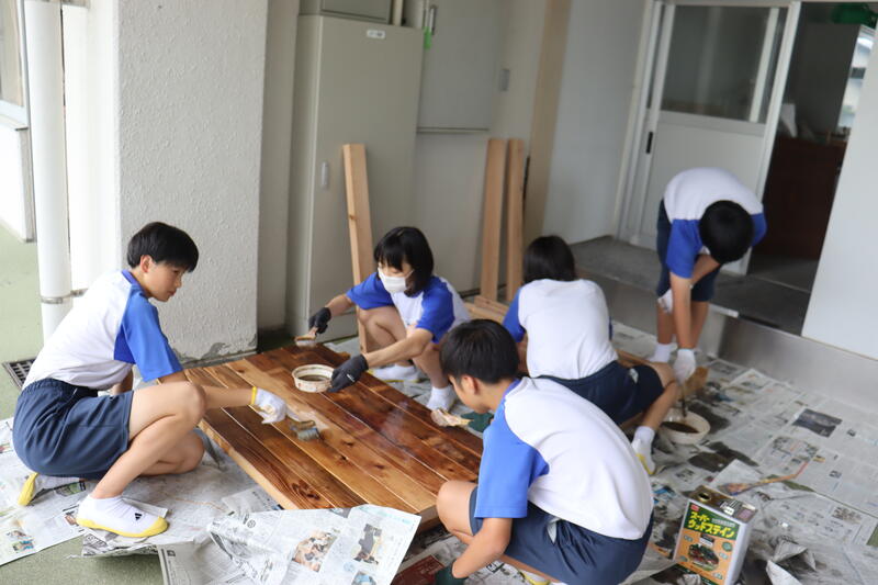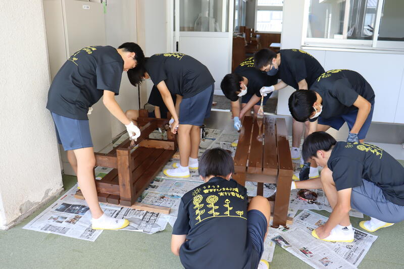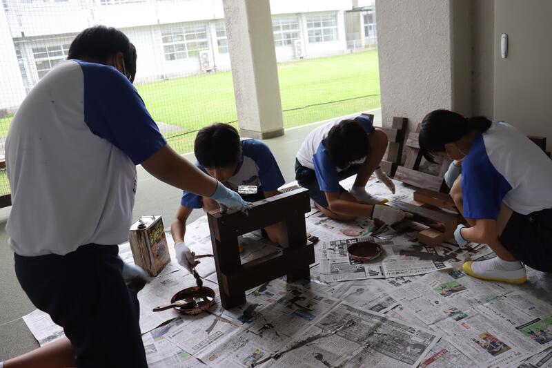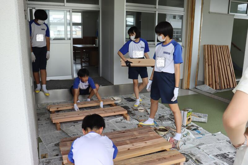 中学3年生は、「うきうきひまわり園」の開園に向けて、着々と準備を進めています。会場に設置するベンチもいよいよ完成です!とても素敵なベンチができました。