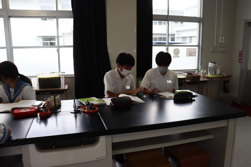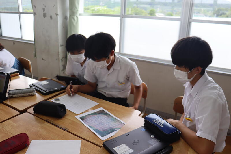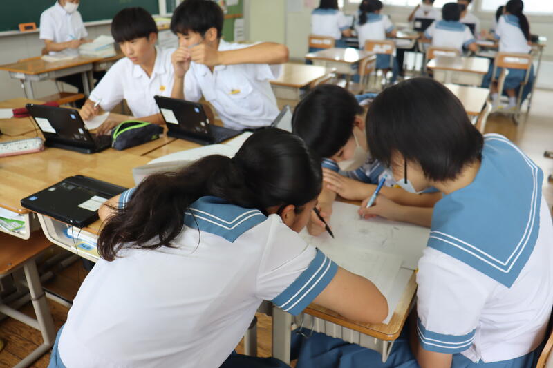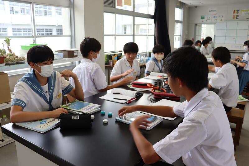 中学3年生は理科で「遺伝の規則性と遺伝子」の学習をしていました。ペットボトルのキャップを使って考えています。期末テストも終わり、リラックスした雰囲気です。次は共通テストに向けて、これからさらにがんばる3年生です。ファイト!