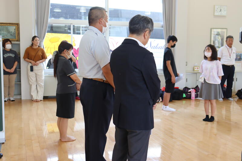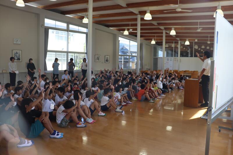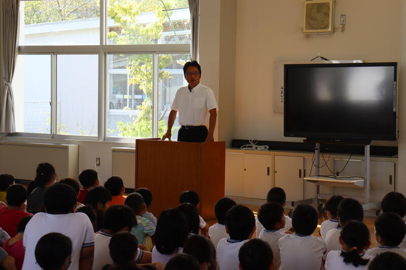 小学校の前期後半始業集会の様子です。校長先生の「夏休み、短かったなあーと感じた人?」という問いかけに、たくさん手が挙がりました。みんな、楽しい夏休みを過ごしたようです。