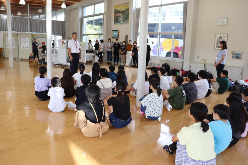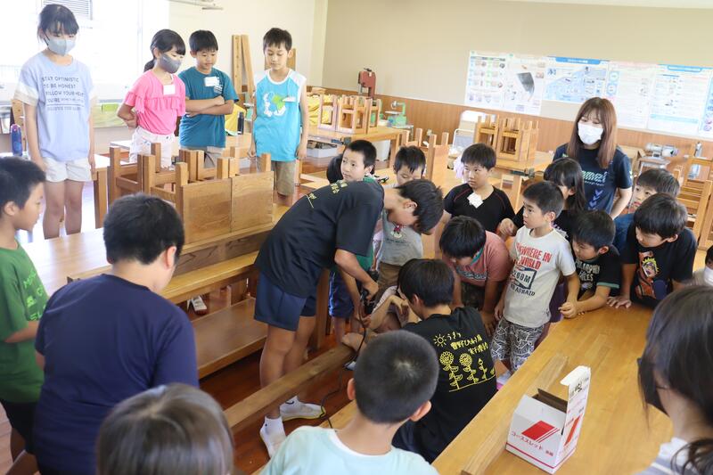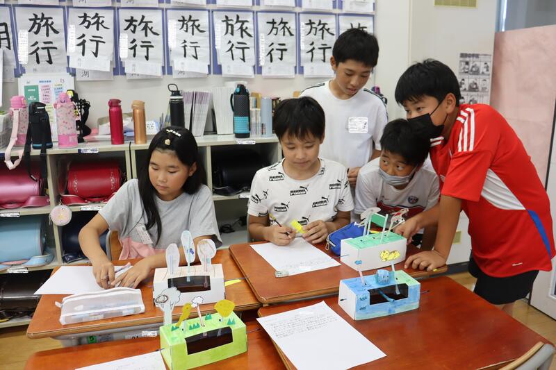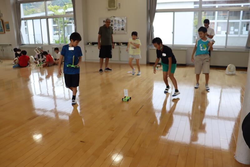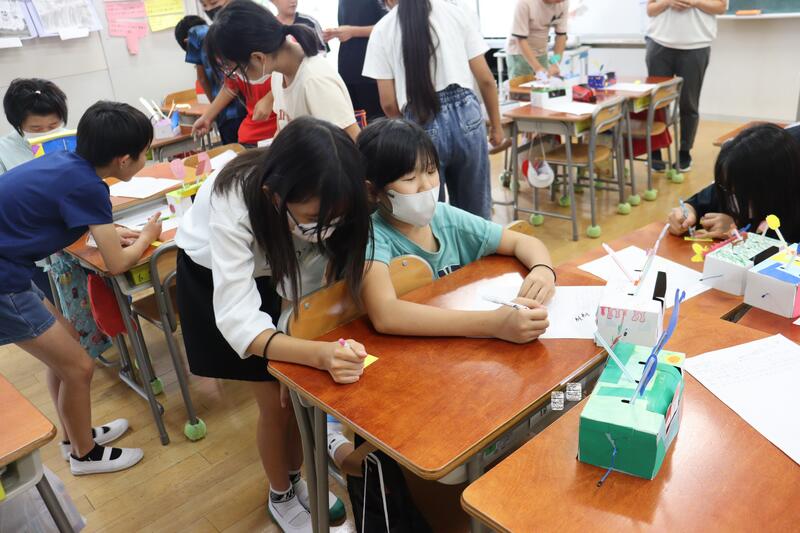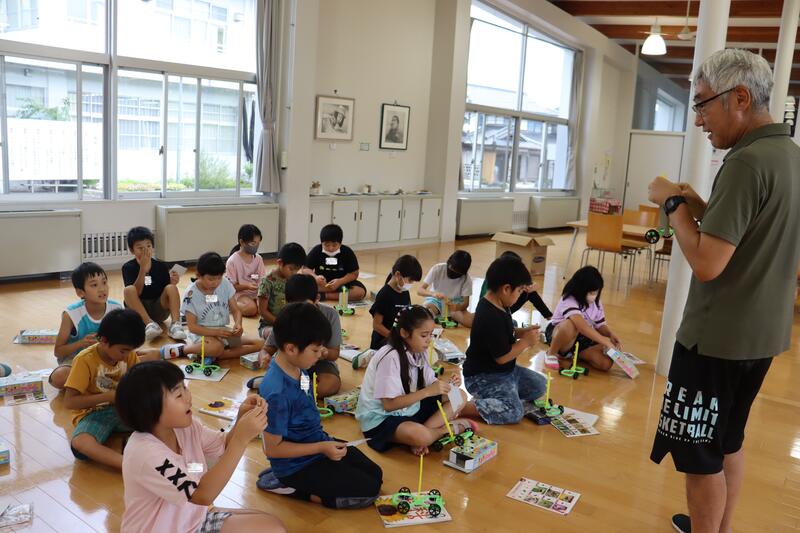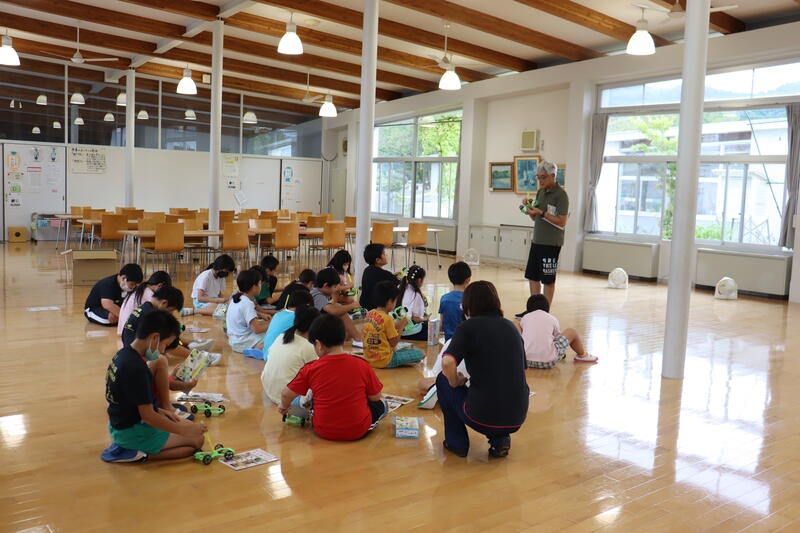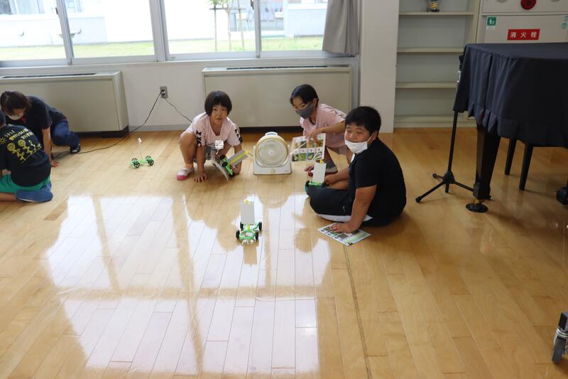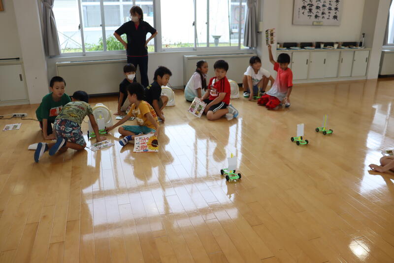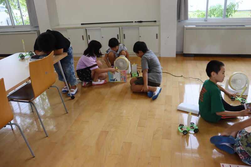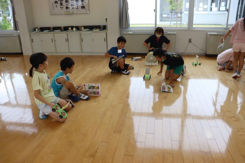 多目的ルームでは、小学3年生が理科の学習をしていました。風の力を利用して、帆をはった車を走らせるようです。どうやったら遠くまで車を走らせることができるのでしょうか。みんなで意見を出し合いながら工夫していました。