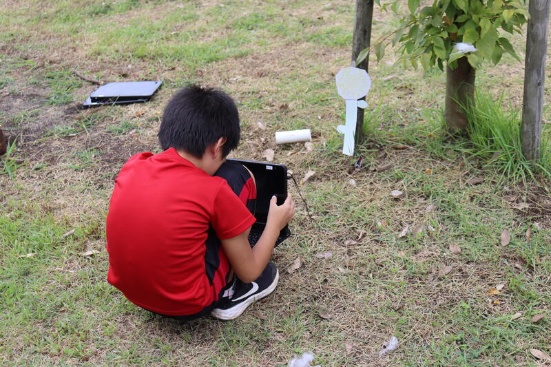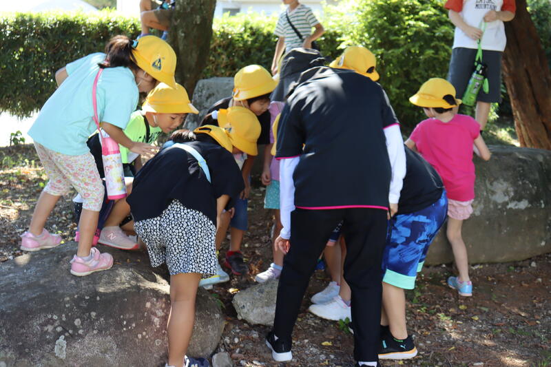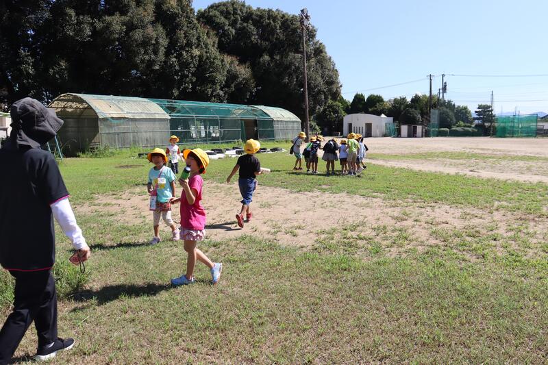 小学1年生は、校庭で虫さがしをしていました。バッタやこおろぎ、カエルなどをみつけました!