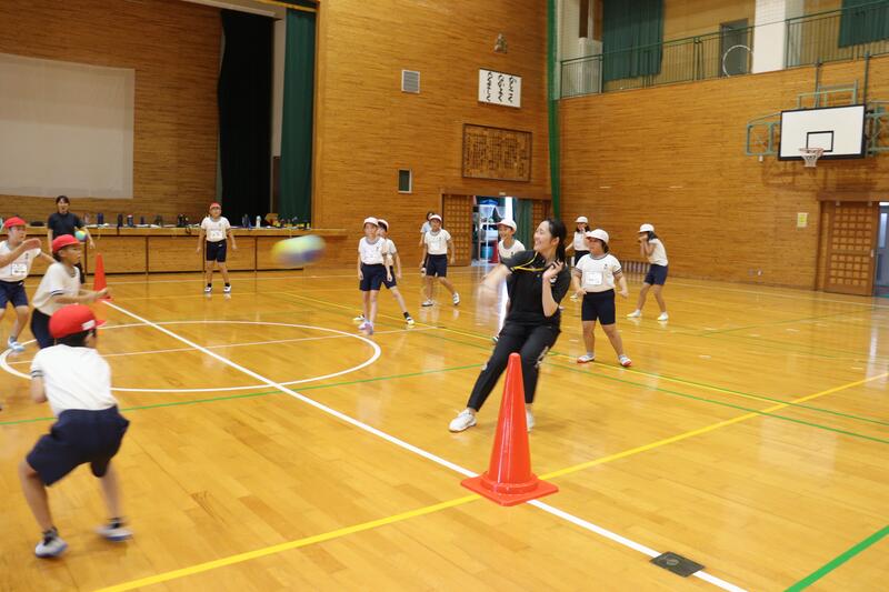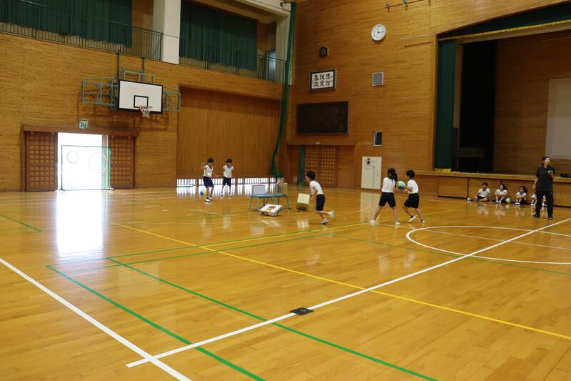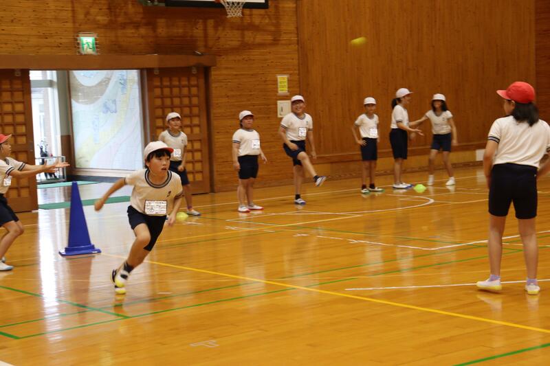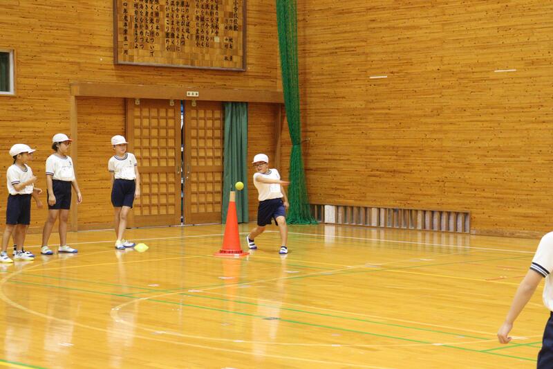 小学2年生は、体育でボール投げをしていました。真ん中においた的(箱)にボールを当て、的を倒すとポイントが入るようです。ボールを投げる高さや強さを調整しながら、とても上手に命中させていました。チームの協力もばっちりです。