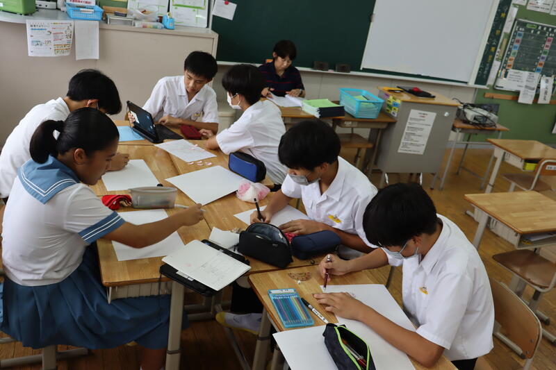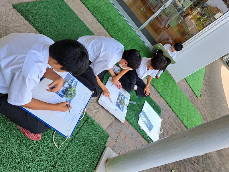 中学1年生は、美術で写生にチャレンジしています。思い思いの場所で学校内の風景を描いていました。