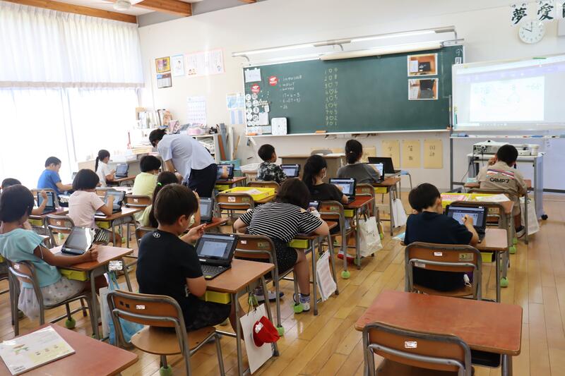 小学2年生は、タブレットPCで算数の問題を解いていました。繰り下がりのあるひき算、難しいですねー。みんな、さいごまでもくもくと問題に向かっていました。がんばれ2年生!