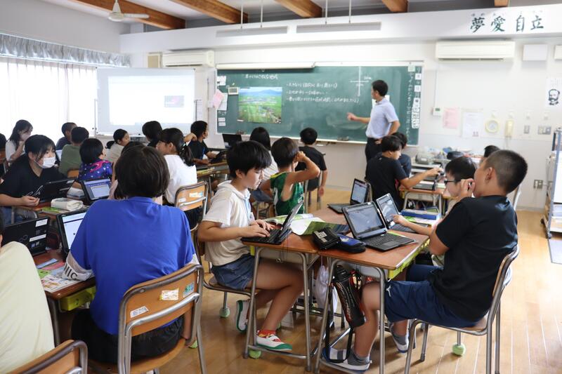 小学5年生もタブレットPCを使って社会の学習をしていました。タブレットPCに配付されたシートに書き込んだり考えを交流したりするなど、どんどんスキルアップしています。