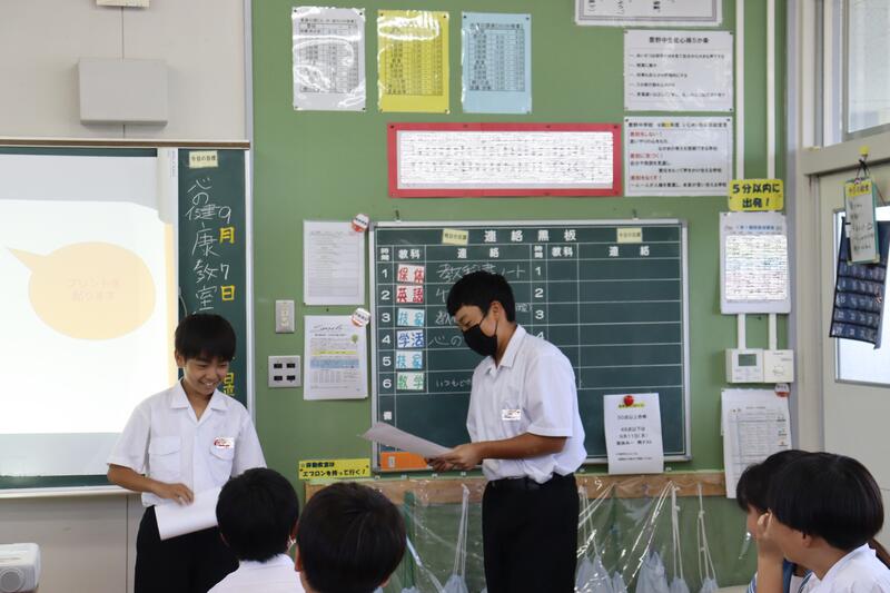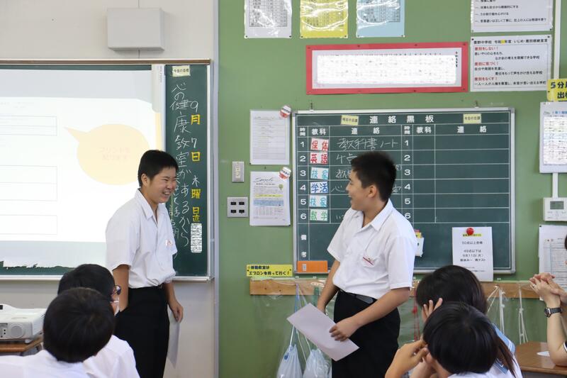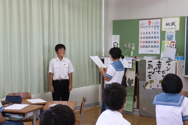 中学2年生は「私はだれでしょう」を楽しんでいました。ヒントをもとに、だれのことか考えています。友達を知るよい機会です。