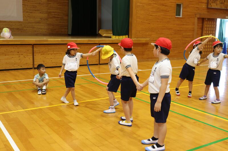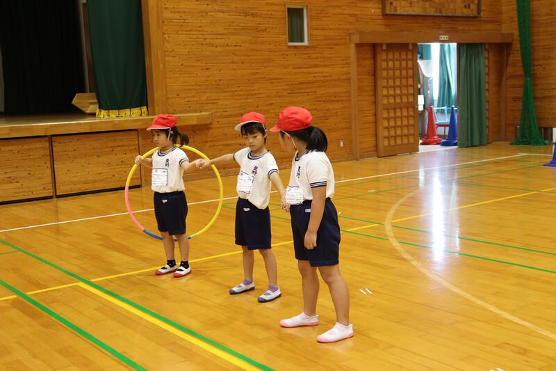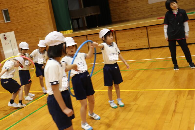 小学1年生の体育の様子です。友達と協力し合ってフラフープを渡していきます。とてもやさしく声をかけ合いながら、体に輪をとおし、渡していました。うれしくほほえましい光景でした。