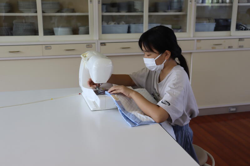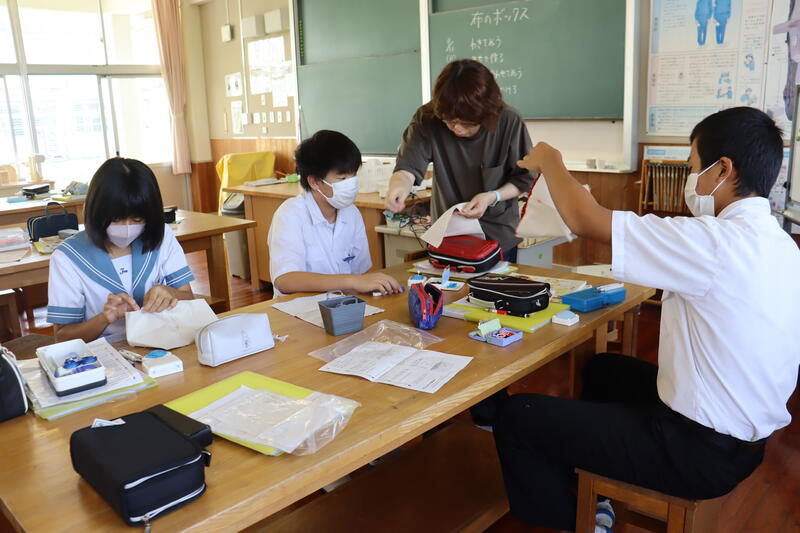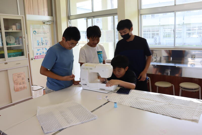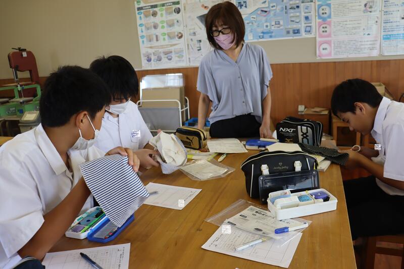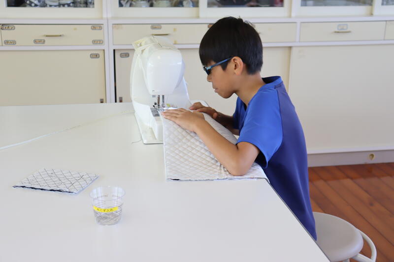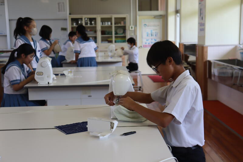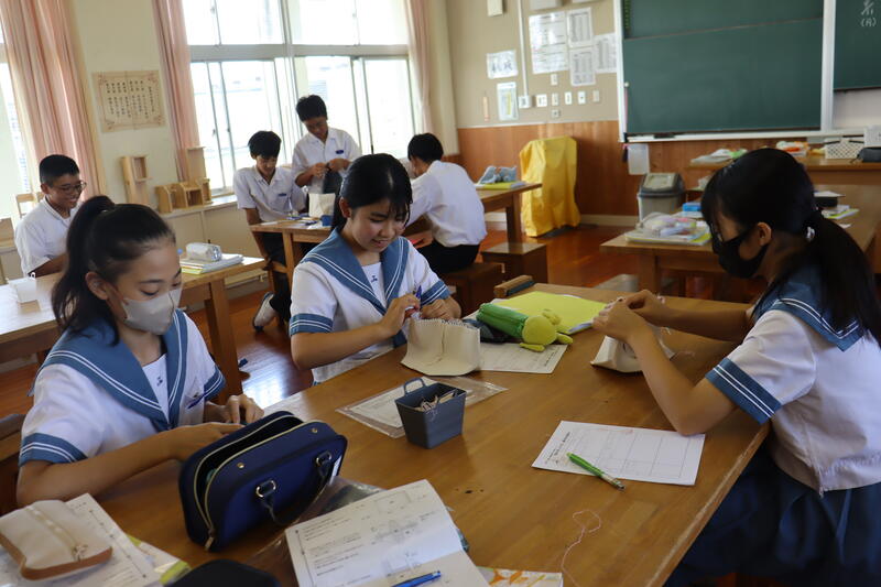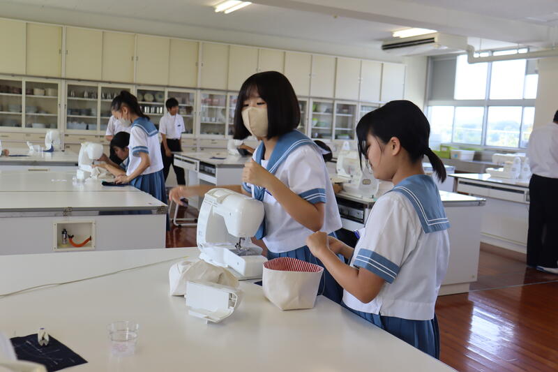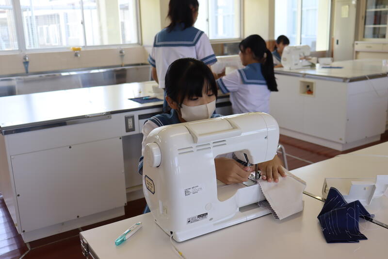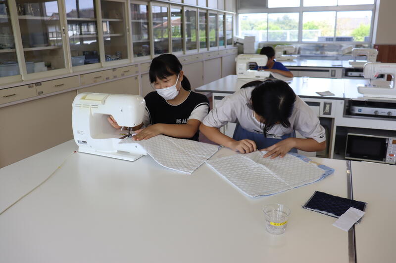 中学2年生、こちらも家庭科でした。布ボックスをつくっています。表布、裏布を合わせて縫います。中学生になると、ミシンの扱いも慣れたものです。かわいいボックスが出来上がりそうです。