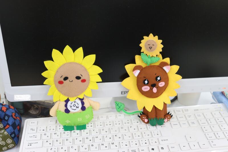 家庭科の先生がマスコットを作ってくださいました。左は初代ひまわり園イメージキャラクター「ひまりん」、昨年度の中学3年生(現高1)が考案しました。右は二代目キャラクター「ひまじー」、今年度の中学3年生が考案しました。どちらもかわいい!生徒のアイデア、創造力に驚くばかりです。ひまわり園の開園が楽しみです。9月22日(金)午後に、会場での子どもたちの活動も予定しています。お楽しみに!