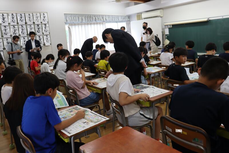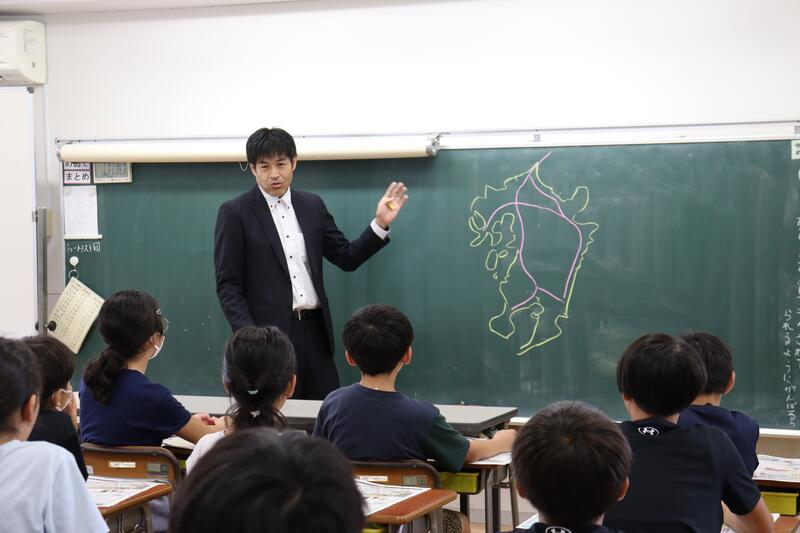 新聞の印刷工場は鳥栖にあるそうです。なぜ鳥栖なのか、九州の地図と新幹線のルートをかいて分かりやすく説明してくださいました。地図がお上手でみんなびっくりしました!