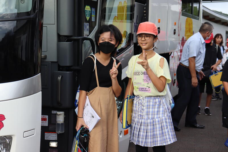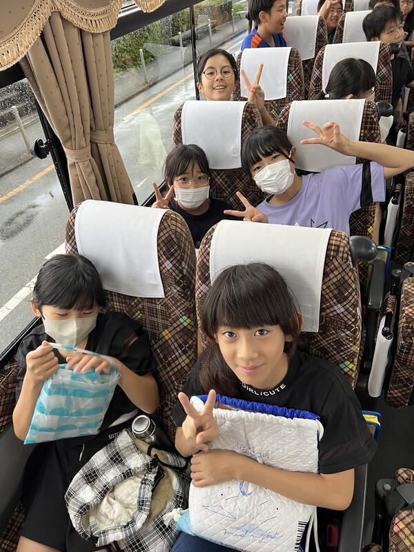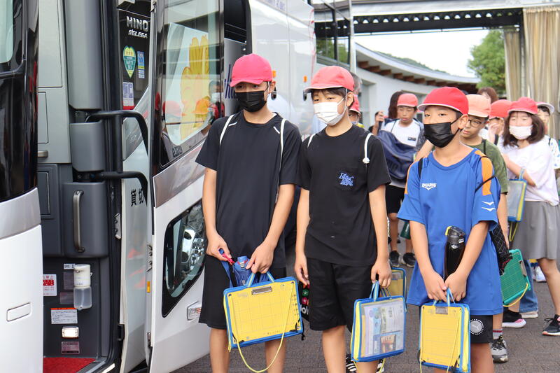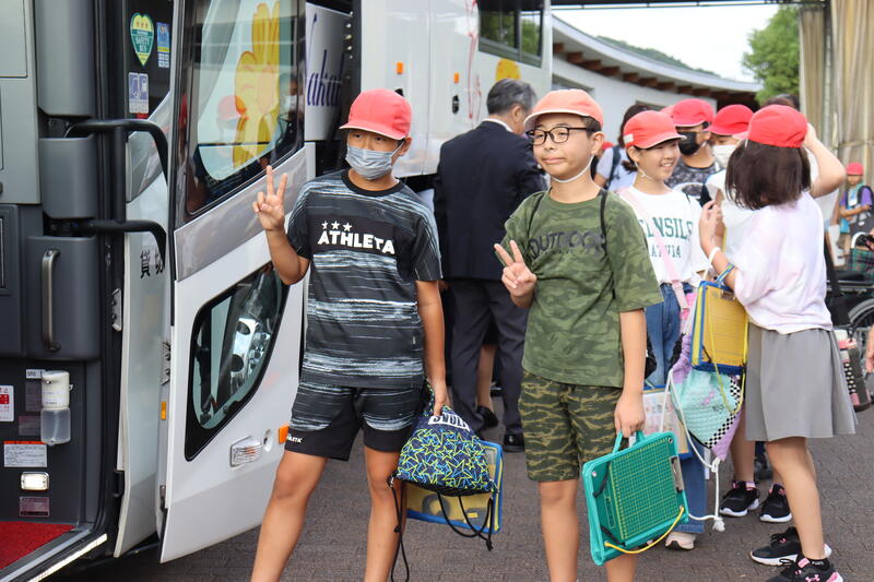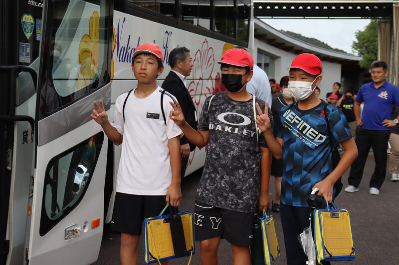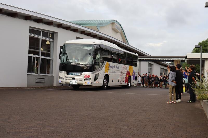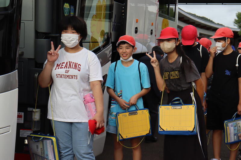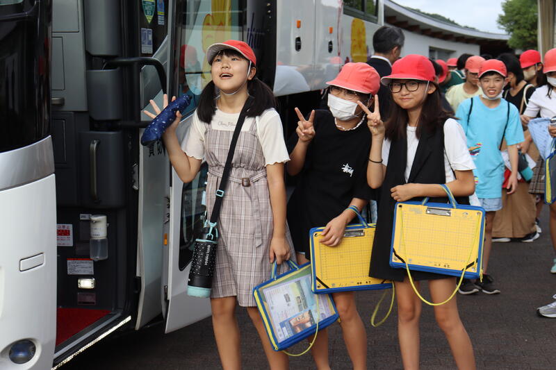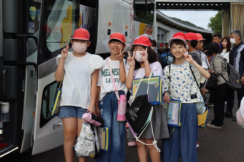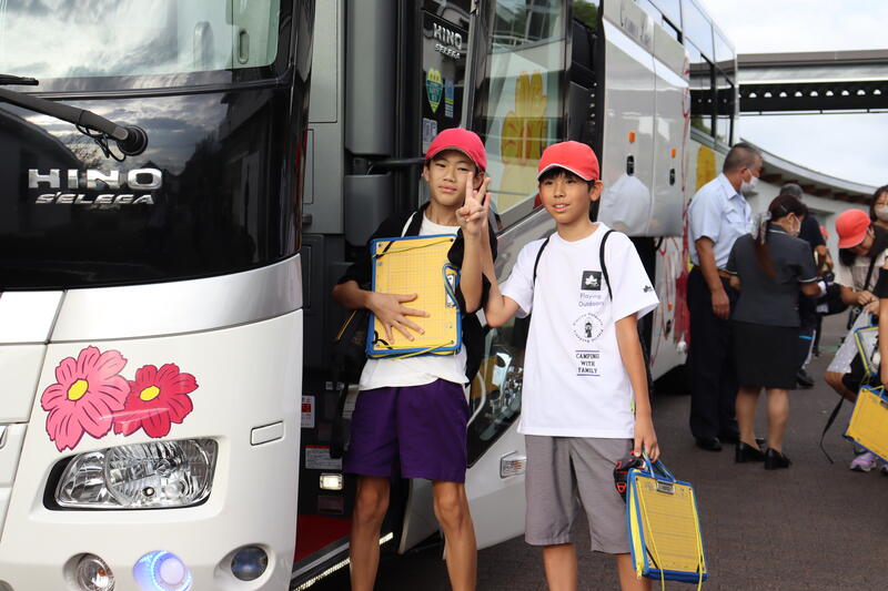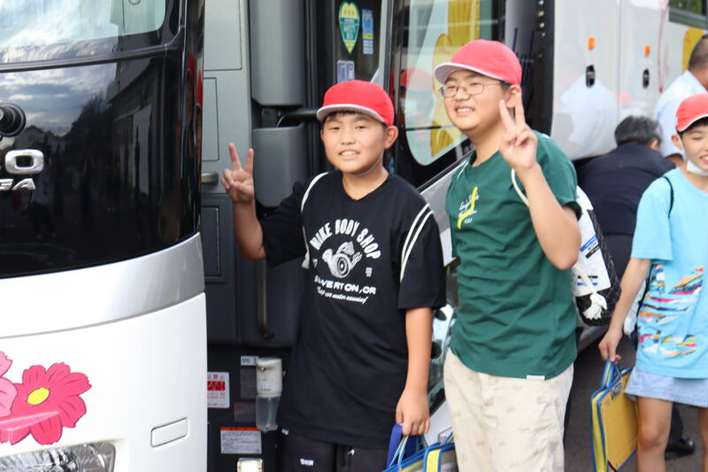 小学生、中学生、保護者のみなさま、先生たちに見送られて出発です!
