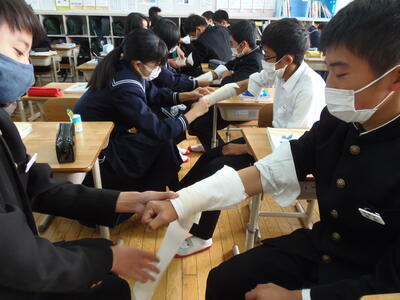 中学2年生は、養護教諭の福岡先生を講師に、止血法や包帯法などを学習していました。