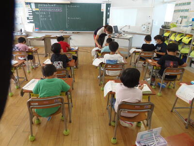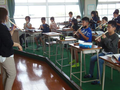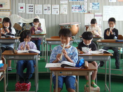 小学4年生は、音楽の授業でした。「陽気な船長」のリコーダーテストの日です。スタッカートの使い方を練習し、この後、一人づつテストを受けました。みんな真剣に取り組んでいました。