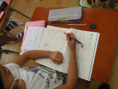 教科書の物語にある「主語と述語」にしるしをつけて、担任の先生に確認していました。