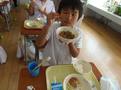 いただきますの後は、一心不乱に食べ始めました。午前中体育の授業もあり、お腹がすいていたようです。