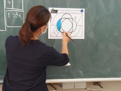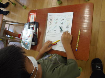 「かずの線を見てかんがえよう!」というめあてで、教科書を使って勉強していました。すごろくの絵と実線の絵を見比べて、その違いを見つけていました。