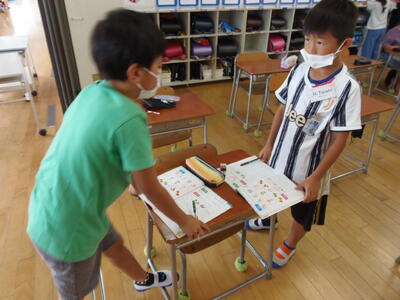 最初に違いを自分で見つけて、近くの友達と相談し、発表していました。