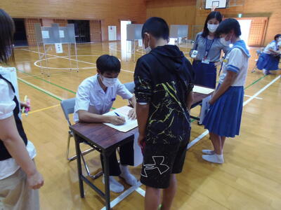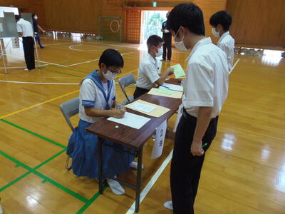 新生徒会の立候補者に選挙管理委員会から選挙運動に関する説明がありました。立候補者は、緊張の面持ちで説明を聞いていいました。