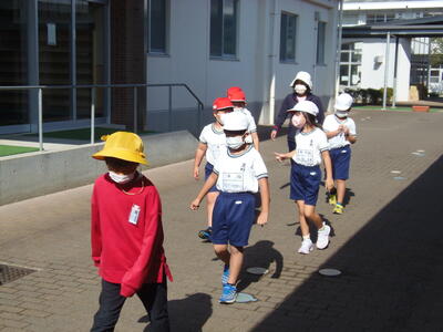 小学1年生が、体育の授業でグラウンドに移動する様子です。きちんと並んでから移動します。1年生にとっては、一つ一つのことが、勉強です。