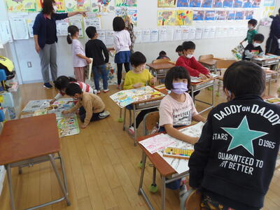 自分たちで自由につけてごらんと言われ、張り切って準備しています。